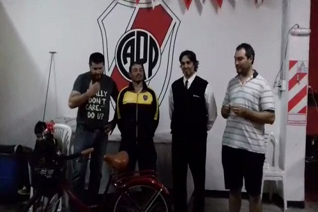 Fue a la Filial a recibir la bicicleta con una campera con el escudo de Boca para demostrar que se puede convivir en paz.