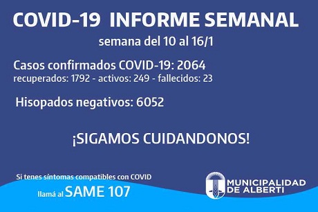 La secretaría de Salud publicó esta mañana el informe semanal que establece la situación epidemiológica de Alberti en función de la pandemia, puntualizando en que en la última semana se registraron 355 casos positivos de coronavirus y que al momento hay 249 activos ya que 112 personas recibieron el alta médica.