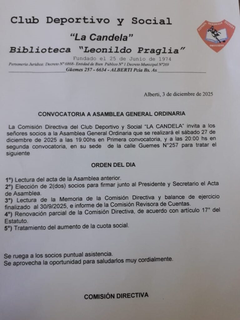 CONVOCATORIA A LA ASAMBLEA GENERAL ORDINARIA DE LA CANDELA Navegación de entradas Anterior CONVOCATORIA ASAMBLEA GENERAL ORDINARIA DEL CLUB SAN LORENZO